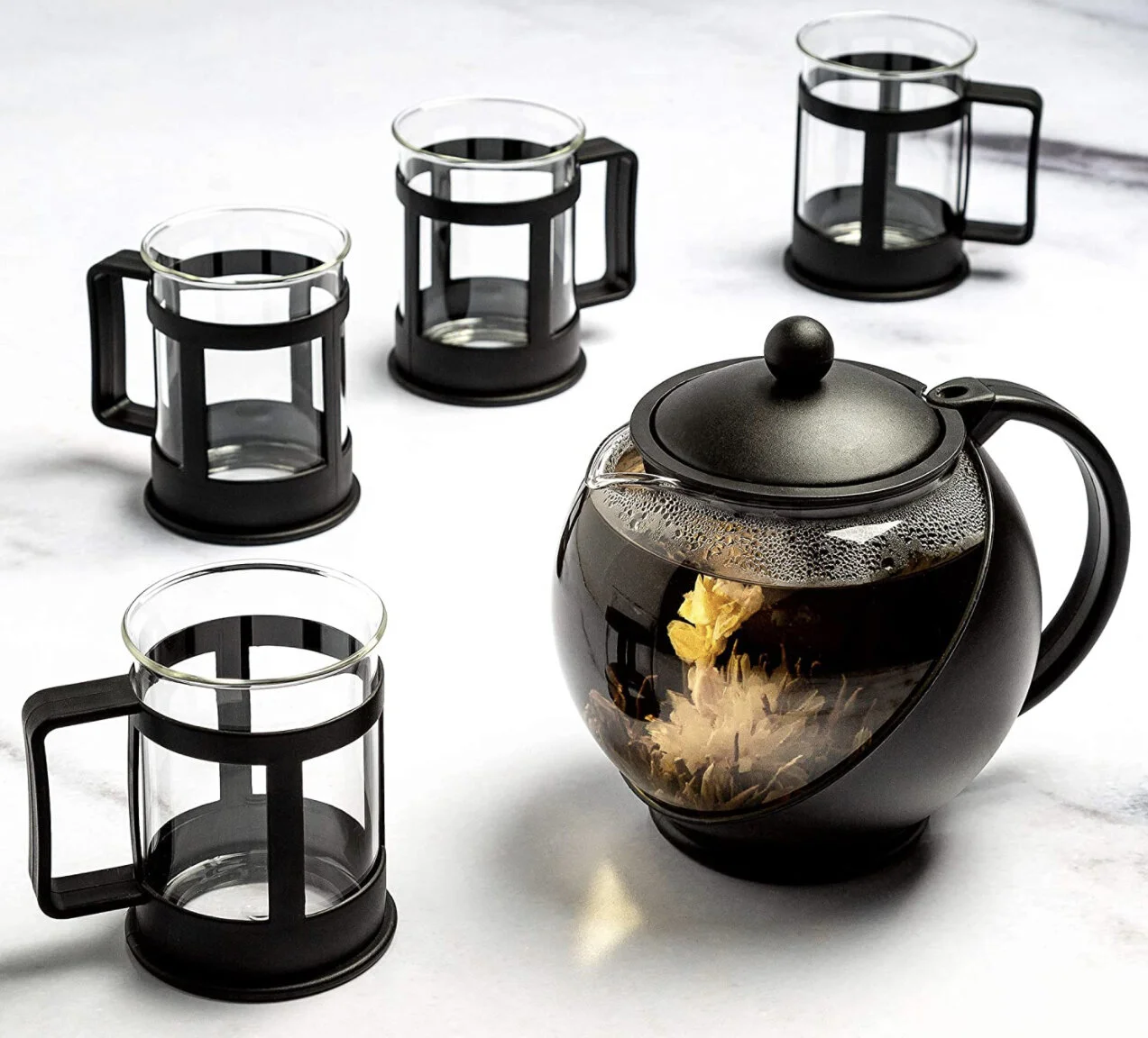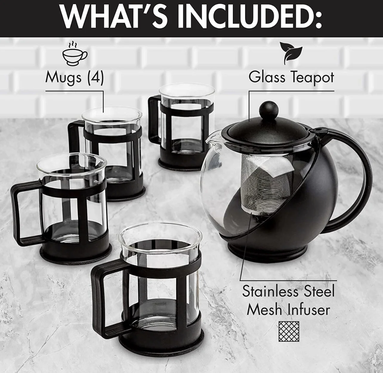 EASY TO CLEAN SET INCLUDES: (1) Black Half-Moon Teapot with lid, (1) Stainless Steel Tea Infuser or Tea Strainer, and (4) Matching glass tea cups. The teapot, infuser, and tea cup set are dishwasher safe, making it easy to clean in between uses.